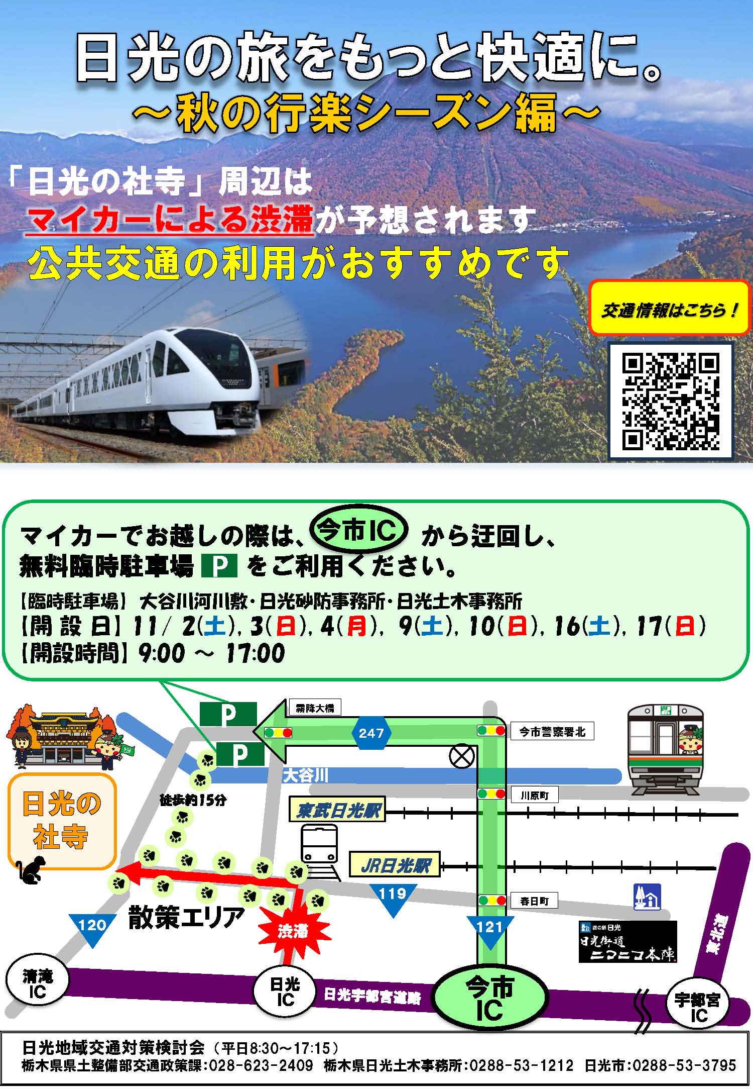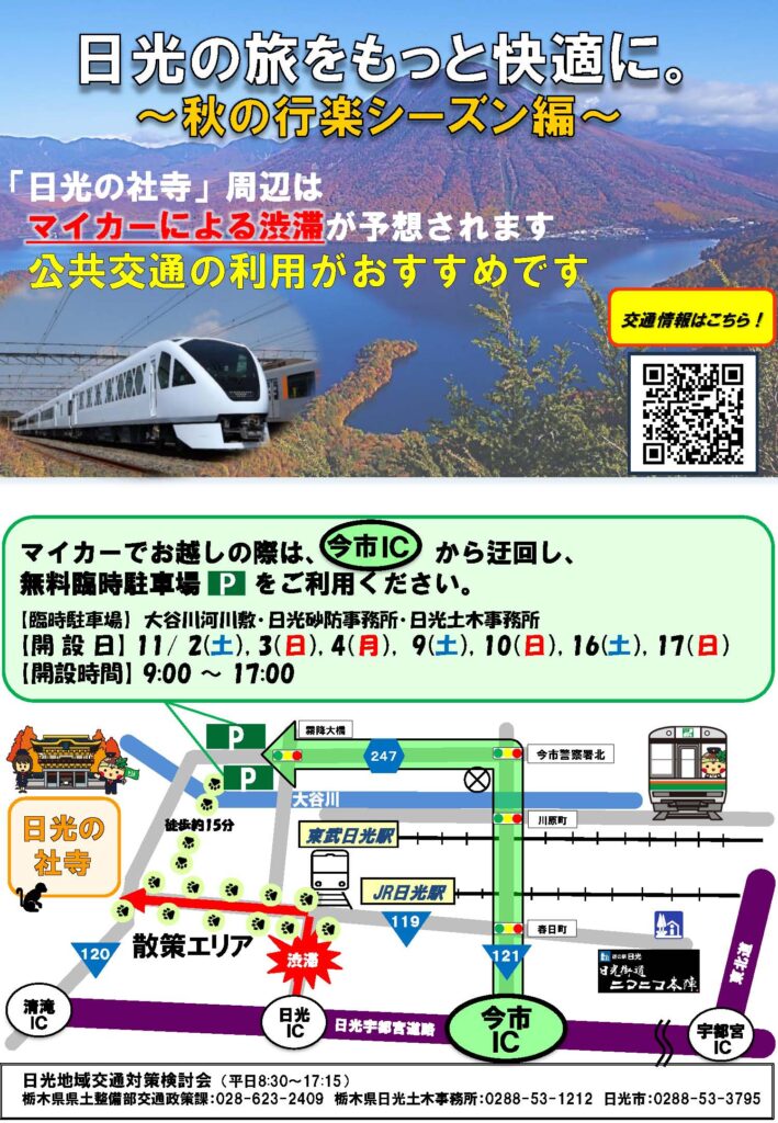 日光地域交通対策検討会の今年の紅葉時期渋滞対策として、臨時駐車場を以下のとおり開設いたします。