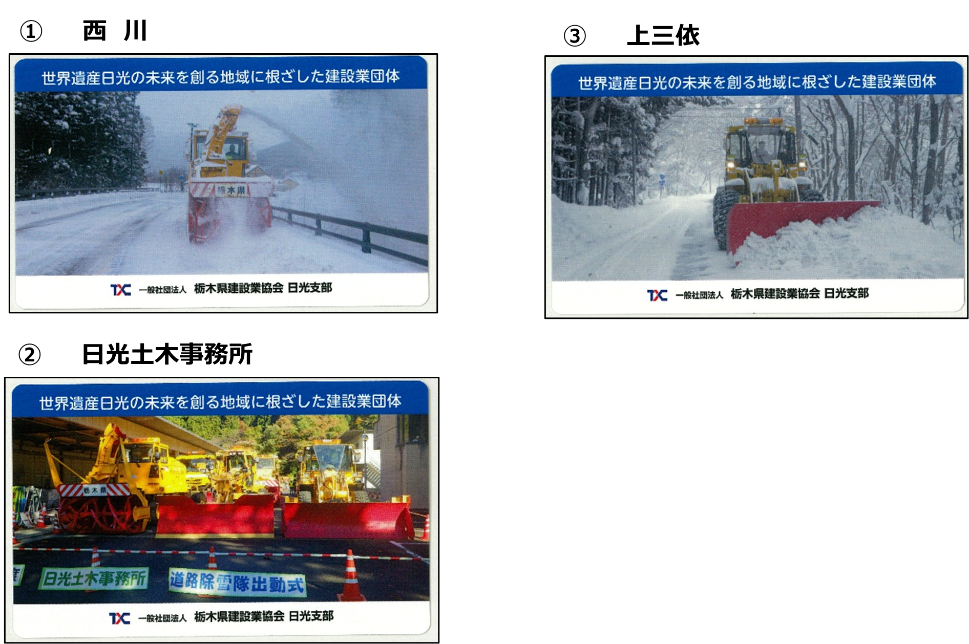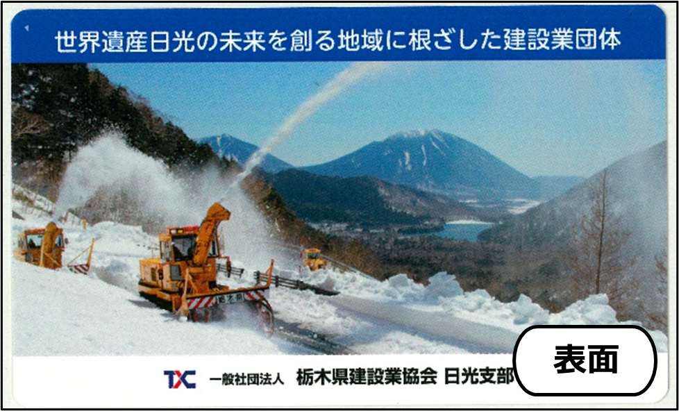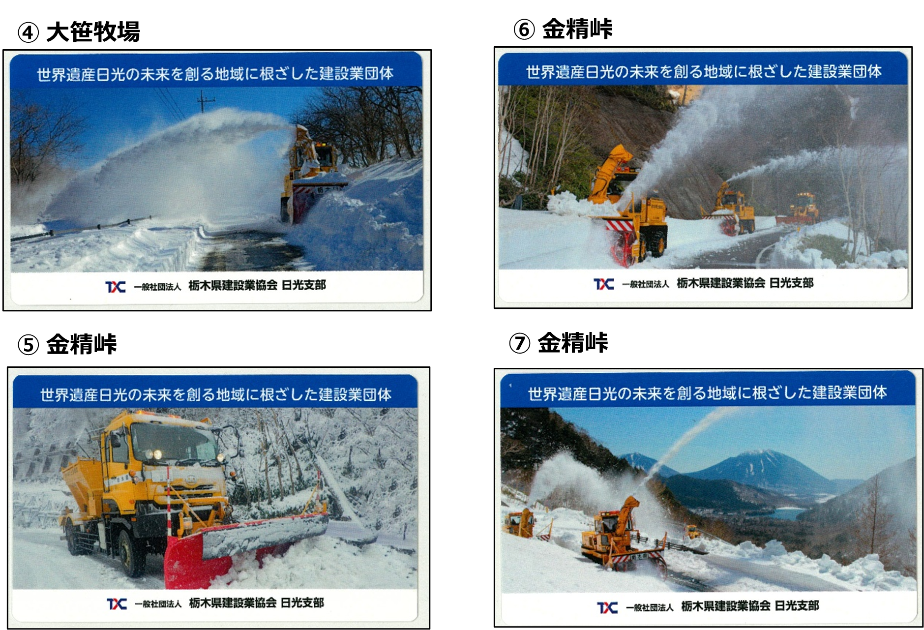 本カードは、日光地域の冬の住民生活に欠かすことができない除雪車両の写真を掲載し、栃木県建設業協会日光支部様で、住民の安心安全、